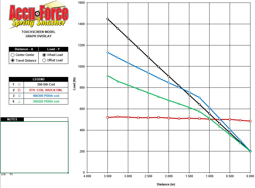 The outer spring starts compressing the last 1” of travel of the right front. The inner spring engages the last 1/4” to 3/8” of travel. This allows the spring combination to travel more without coil binding the bump spring.